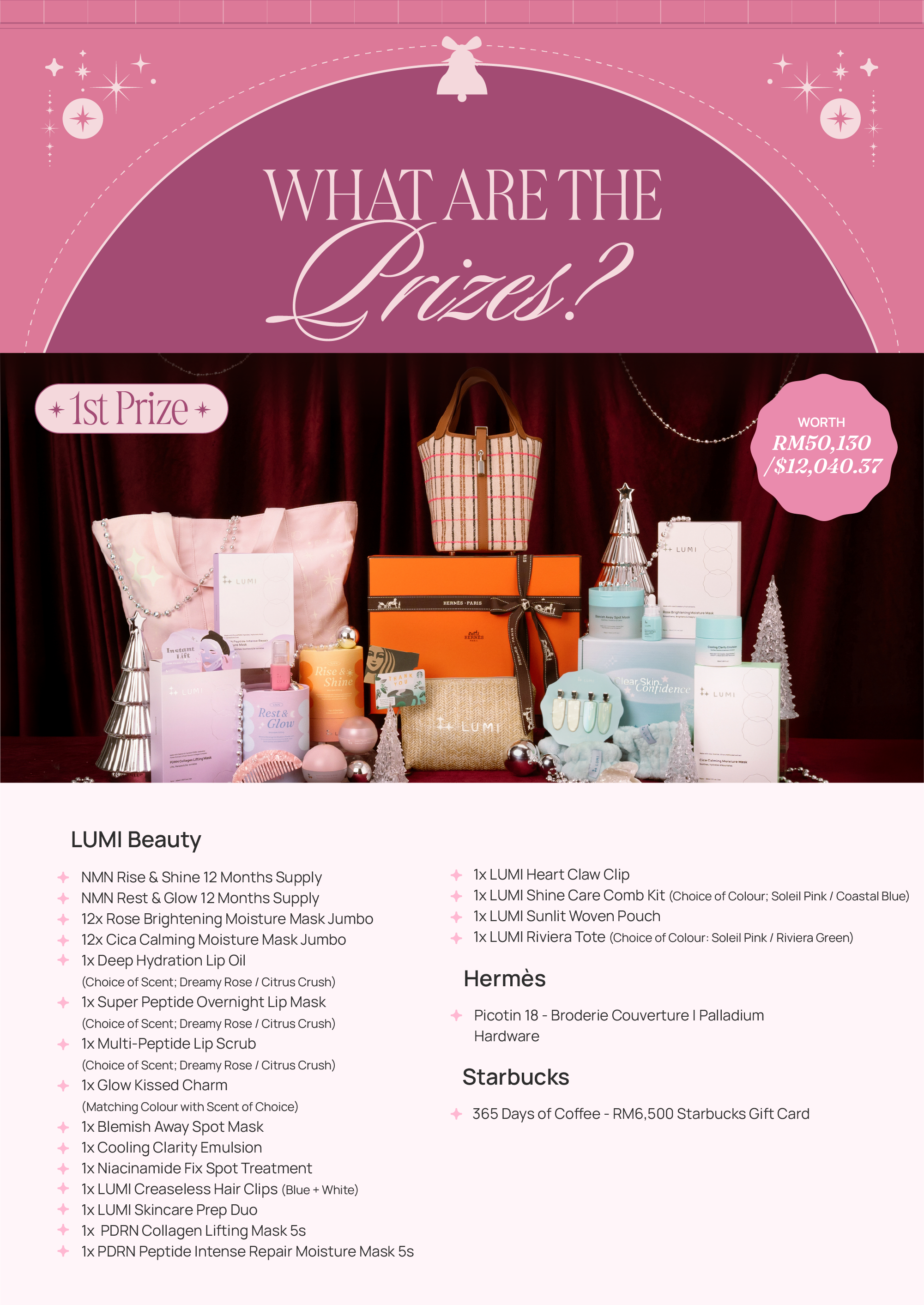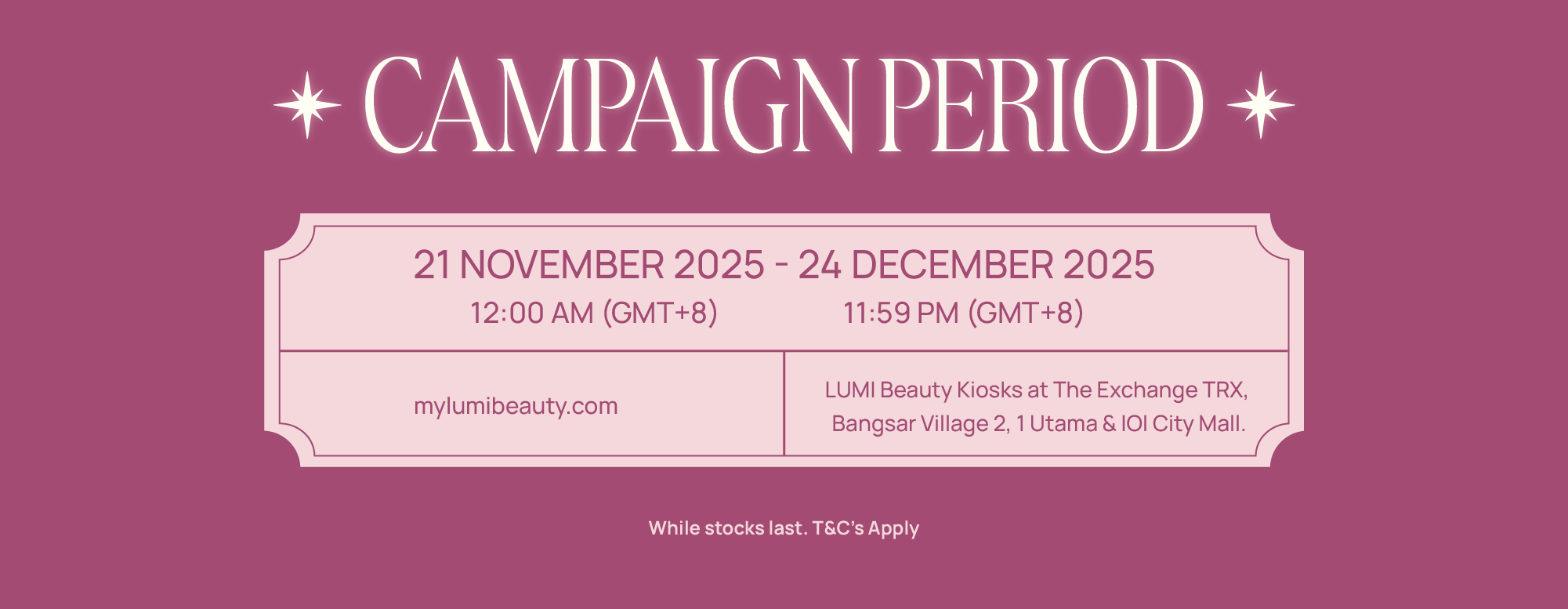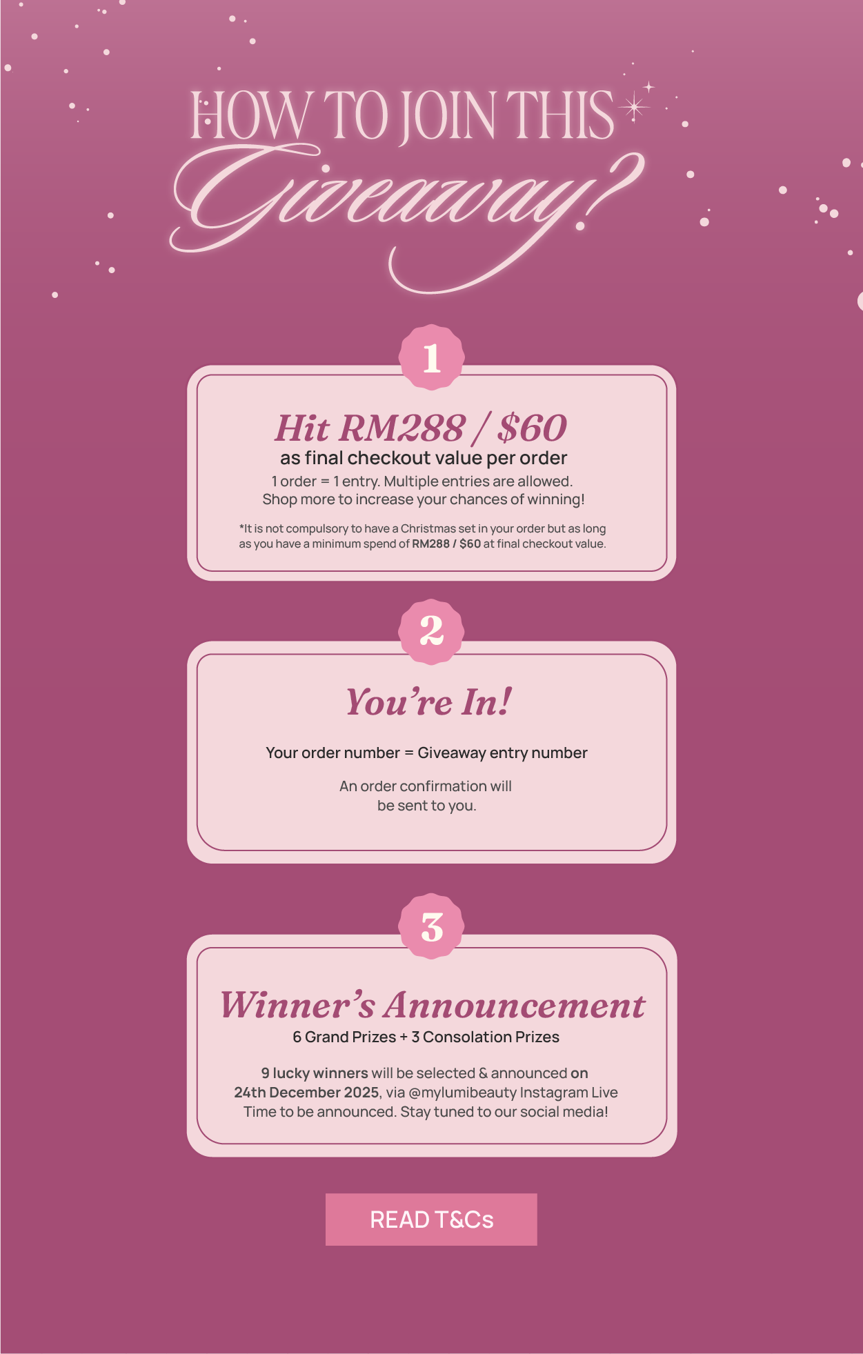 Orders with final checkout value of RM288 / $60 and above, made between 12.00am (GMT+8), 21st November 2025 to 11:59pm (GMT+8), 24th December 2025 on our website mylumibeauty.com and / or LUMI Kiosk at The Exchange TRX, Bangsar Village 2, 1 Utama and IOI City Mall will automatically be eligible for the giveaway.