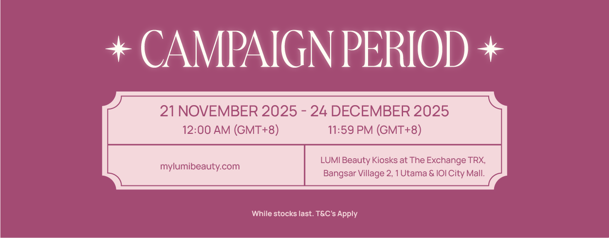 All products available on our website mylumibeauty.com and LUMI Beauty Kiosks at The Exchange TRX, Bangsar Village II, 1 Utama & IOI City Mall. Please kindly note that orders made from Shopee, Zalora, Tiktok Shop, Vending Machines, Guardian and R Pharmacy will NOT be eligible to join the giveaway.